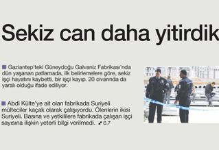 Gaziantep’te bulunan Güneydoğu Galvaniz Fabrikası’nda buhar kazanının patlaması sonucu dün 8 işçi hayatını kaybetti, 13’ü ağır 20 işçi yaralandı. 4. Organize Sanayi Bölgesi’nde bulunan ve Abdi Külte’ye ait olduğu bildirilen fabrikada sabah saatlerinde gerçekleşen patlamaya ilişkin devlet yetkililerinden yine "kaçınılmaz kaza" yorumları geldi. Gün içinde fabrikadaki ölü sayısına ilişkin çelişkili açıklamalar yapılırken, fabrika yönetiminin çalışan sayısına ilişirin sağlıklı veri sunmaması da dikkat çekti.