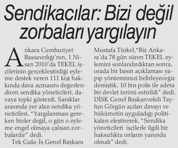Ankara Cumhuriyet Başsavcılığı’nın, 1 Nisan 2010’da TEKEL işçilerinin gerçekleştirdiği eyleme destek veren 111 kişi hakkında dava açmasını değerlendiren sendika yöneticileri, davaya tepki gösterdi.
