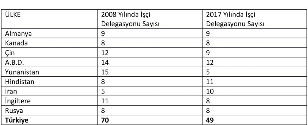 Aşağıdaki çizelgede, ILO’nun resmi delegasyon nihai listesi belgesine göre, 2008 ve 2017 yıllarında çeşitli ülkelerin işçi delegasyonu üye sayıları verilmektedir.