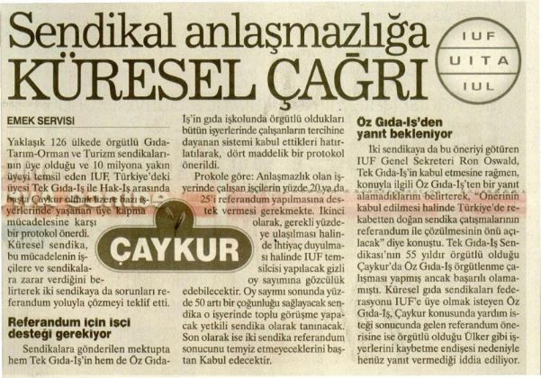 Yaklaşık 126 ülkede örgütlü Gıda Tarım-Orman ve Turizm sendikaları nın üye olduğu ve 10 milyona yakın üyeyi temsil eden IUF, Türkiye´deki üyesi Tek Gıda-Iş ile Hak-İş arasında başta Çaykur olmak üzere bazı işyerlerinde yaşanan üye kapma mücadelesine karşı bir protokol önerdi. Küresel sendika, bu mücadelenin işçilere ve sendikalara zarar verdiğini belirterek iki sendikaya da sorunları referandum yoluyla çözmeyi teklif etti.