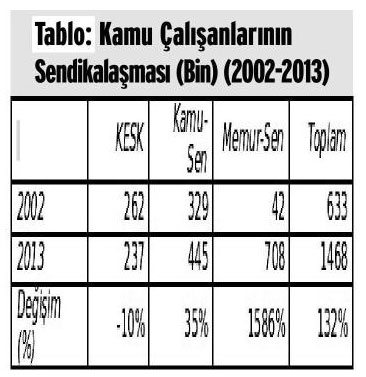 Sendikalı memurların yüzde 48’ini temsil eden Memur-Sen toplu sözleşme heyetinde yüzde 80 oranında temsil edilecek. Tabloda üç büyük kamu çalışanı konfederasyonunu 4688 sayılı yasanın kabulünün ardından ve AKP dönemindeki üye sayıları ve değişim oranı yer almaktadır. Sendikalı kamu çalışanı sayısının bu dönemde yüzde 132 artarak 633 binden 1 milyon 468 bine ulaştığı görülüyor. Ancak bu artışın konfederasyonların üye sayısına yansıması ise ciddi bir asimetri gösteriyor. KESK’in üye sayısı yüzde 10 oranında gerilerken, Kamu-Sen’in üye artışı ise yüzde 35 ile sınırlı kalmış. Asıl astronomik artış artış ise Memur-Sen’in üye sayısında yaşanıyor. 2002’de 42 bin olan üye sayısı 2013’te yüzde 1586 oranında bir artışla 708 bine ulaşmış durumda. Memur-Sen sendikal bir "destana" imza atarak rakiplerini "bozguna" uğratmış durumda Bir diğer ifadeyle bu 11 yıllık dönemde sendika üyesi olan 835 bin yeni üyenin 666 bini Memur-Sen’e ait.
