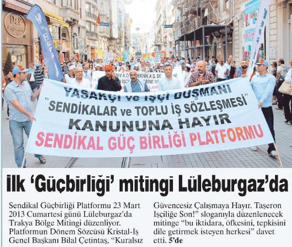 Sendikal Güç Birliği Platformu’nu oluşturan Hava-İş, Kristal-İş, TÜMTİS, Deri-İş, Petrol-İş,TGS, Tek-Gıda-İş, Belediye-İş, Tez Koop-İş, Basın-İş Sendikaları 23 Mart Cumartesi günü Lüleburgaz’da Trakya Bölge mitingi düzenlemeye hazırlanıyor.