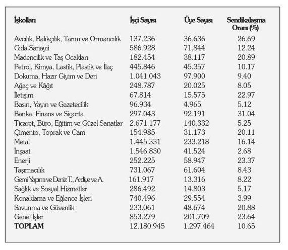 Çalışma ve Sosyal Güvenlik Bakanlığının Ocak 2015 istatistiklerine göre, işçi sendikalannın üyelerinin işkollarına göre dağılımı aşağıdaki tabloda yer almaktadır. Türkiye’de 12.2 milyon işçi, 1.3 milyon sendika üyesi var. Sendikalaşma oranı yüzde 10.65. Bu rakamlar doğru mu? Tam değil. Sendika üyesiyken işsiz kalanlar bir yıl süreyle üyeliğini sürdürüyor. Bir işyerinde toplusözleşme kapsamında sendika üyesiyken o işyerinden ayrılıp aynı işkolunda sendikasız başka bir işyerine giren işçinin üyeliği devam ediyor. Bazı işyerlerindeki işçiler de, bir örgütlenme çabasının parçası olmadan bir sendikaya üye oluyorlar.