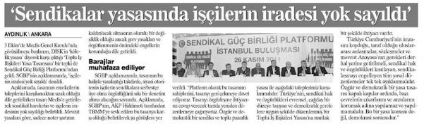 3 Ekim’de Meclis Genel Kurulu’nda görüşülmeye başlanan, DİSK’in ‘kölelik yasası’ diyerek karşı çıktığı Toplu İş İlişkileri Yasa Tasarısına’ bir tepki de Sendikal Güç Birliği Platformu’ndan geldi. SGBP’nin açıklamasında, ‘işçilerin iradesi yok sayıldı’ denildi.