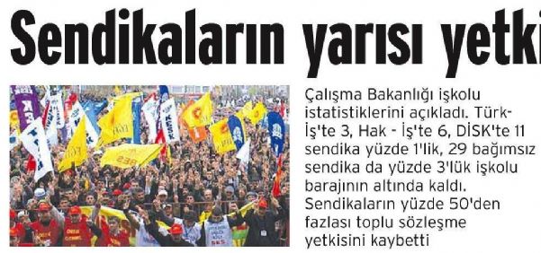 İstatistiklere göre 1 milyon 2 bin işçi sendikalı.Türk-İş üyesi 33 sendikadan 30’u barajı aşarken, üç sendika (Orman-İş, Deri-İş ve TGS) barajı aşamadı. Hak-İş üyesi 14 sendikadan 8’i barajı aştı. DİSK üyesi 15 sendikadan ise sadece 4’ü barajı aşabildi. Dev Sağlık-İş, Sosyal-İş, Nakliyat-İş, Limter-İş barajı aşamayan sendikalardan.