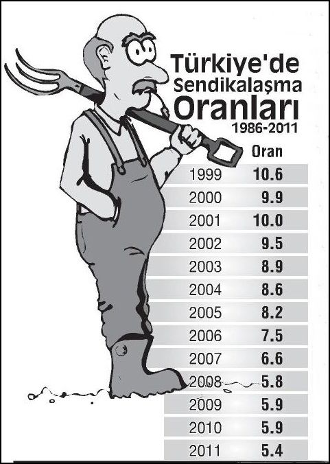 OECD verilerine göre son 11 yılda Türkiye sendikalaşmada yüzde 46 geriledi. OECD´nin itibar etmediği Çalışma Bakanlığı verilere göre Ocak 1984 ile Temmuz 2009 arasında sendikalaşma oranı yüzde 60 civarında seyrediyor. Kurum, 2011 için sendikalılık oranını yüzde 5.4 olarak veriyor. Türkiye bu konuda son 50 yılın en dip noktasında yer alıyor.