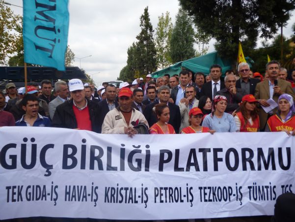 Sendikal Güç Birliği Platformunu oluşturan sendikalar arasında yer alan sendikamız Güç Birliği içindeki diğer sendikalar ile birlikte. TEKGIDA-İŞ Sendikası Genel Merkez Yöneticileri ve sendikamıza bağlı bütün şube başkanlarımız sendikamızın misafiri olan Alman NGG Sendikası eğitim uzmanlarının katılımıyla, Türkiye Deri-İş Sendikası’nın örgütlenme çalışması yaptığı ve yetki başvurusunda bulunduğu Kampana ve Savranoğlu fabrikalarının işverenin sendikal haklara saygı göstermemesini protesto etmek ve İzmir’den İstanbul’a sürgüne getirilen Savranoğlu işçileriyle ve sendikal sebeple işten atılan Kampana işçilerine destek amacıyla bugün saat 12.30’da basın açıklaması yapmak üzere Kampana Deri Fabrikası önünde destek ziyaretinde bulundular.