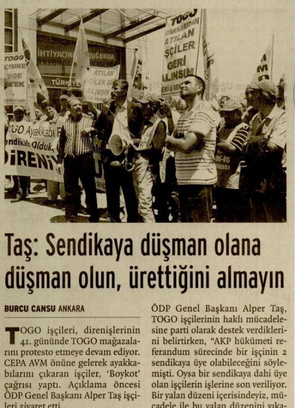 Eskişehir yolu üzerinde bulunan CEPA mağazası önüne yürüyen işçiler, burada bulunan TOGO mağazasını protesto etti. "Sadece üretimden gelen değil, tüketimden de gelen gücümüzü kullanmalıyız" diyen TOGO işçileri ‘Boykot’ çağrısı yaptı.