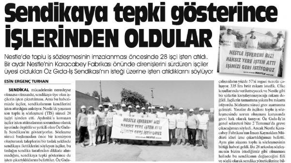 Öz Gıda-İş’in genel sekreteri bize 2 Temmuz’da greve çıkacağımızı söyledi. Ancak Nestle Karacabey Fabrikası’nın İnsan Kaynakları Müdürü idari izne çıkartıldığımızı belirtti. Aynı gün akşamı toplu iş sözleşmesinin bittiği haberi geldi. Bu 28 arkadaş sözleşmenin bizim istediğimiz gibi olmaması halinde bu sendikanın değişeceğini fiili ve sözlü olarak sendika yöneticilerine bildiren kişilerdir ve bu sebepten de işten atıldığımızı düşünüyorum.