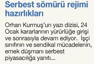 Orhan Kurmuş´un yazı dizisi, 24 Ocak kararlarının yürürlüğe girişi ve sonrasıyla devam ediyor. İşçi sınıfının ve sendikal mücadelenin, emek düşmanı serbest piyasacılığa yanıtı…