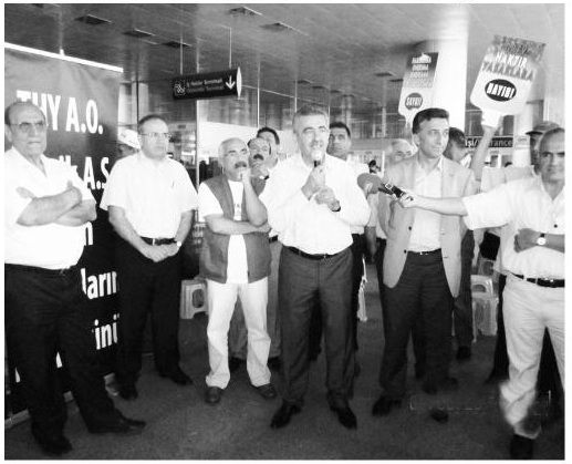 Dış Hatlar Geliş Bölümüne yürüyen sendika yöneticileri ve işçiler, sonuna kadar hava işçilerinin mücadelesini sahiplendiklerini söyledi. Burada söz alan Deri-İş Genel Başkanı Musa Servi, AKP’nin ileri demokrasisinin 12 Eylül Darbe dönemi baskılarına bile pes dedirttiğini söyledi. "AKP, ‘Benim gibi düşünürsen sana yaşam hakkı var. Güvencesiz çalışırsan sana yaşam hakkı var’ diyor" diye konuşan Servi, hava işçilerinin AKP’nin bu hukuksuzluğuna karşı mücadeleyi esas aldığını belirtti.