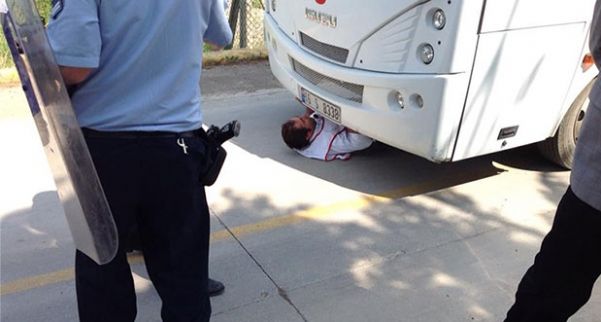 SERVİS ARAÇLARININ ÖNÜNE YATAN İŞÇİLERE GÖZALTI