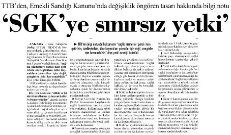 Türk Tabipleri Birliği (TTB), TBMMde komisyonlarda görüşülmekte olan, Türkiye Cumhuriyeti Emekli Sandığı Kanunu ile Bazı Kanunlarda Değişiklik Yapılmasına Dair Kanun Tasarısıyla hükümetin, sağlık hizmetleri paralı hale getirilsin, özelleştirilsin, ülke kaynakları yoksullar için değil, zenginler için harcanabilsindiye yetki istediğini belirtti.
