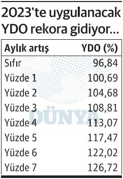 Girişteki küçük tablo durumu tüm açıklığıyla ortaya koyuyor. Ekim ayında oluşacak ve 2023’te uygulanacak YDO’nun en az yüzde 100 olacağı, hatta yüzde 125’i bile geçebileceği ortada.