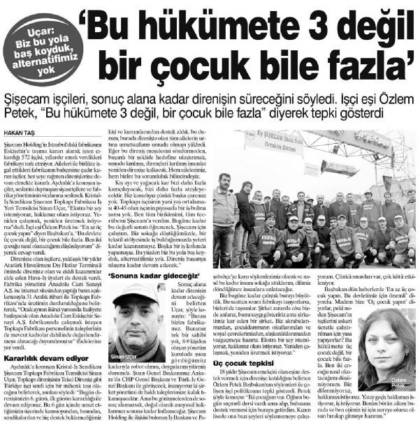 Aydınlık’a konuşan işçiler, seslerini duymayan siyasetçilere ve fabrika yönetiminin vicdanına seslendi. Kristal-İş Sendikası Şişecam Topkapı Fabrikası İş Yeri Temsilcisi Sinan Uçar, "Ekstra bir şey istemiyoruz, hakkımız olanı istiyoruz. Yeniden çalışmak, yeniden üretmek istiyoruz"dedi. İşçi eşi Özlem Petek ise "En az üç çocuk yapın" diyen Başbakan’a, "Bu devlete üç çocuk değil, bir çocuk bile fazla. Ben iki çocuğu nasıl okutacağımı düşünüyorum" diyerek cevap verdi.