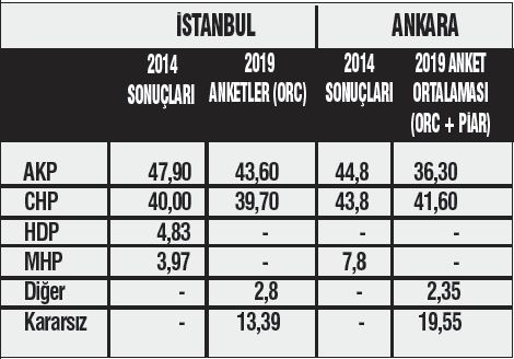 Ankara’da da AKP oyları 2014 seçimlerine göre 8.5 puan, CHP oyları ise 2.2 daha düşük çıkmış. Ancak Ankara’da kararsızlar oranı da yüksektir. Kararsızlar aynı oranda dağıtılırsa, CHP’nin önde olduğu anlaşılıyor.