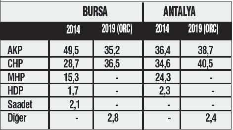 Antalya’da, 2014 seçimlerine göre AKP oy oranında yüzde 2.3 oranında bir artış, CHP oylarında ise yüzde 5.9 puan artışı var. Kararsızların oyları yüzde 2.4 olarak düşük görünüyor. Ancak Antalya’da önceki seçimde yüzde 24.3 oranında oy almış olan MHP’nin oyları erimiş görünüyor. Çünkü Cumhur İttifakı içinde toplam oy oranı yüzde 38.7 olarak çıkmış.