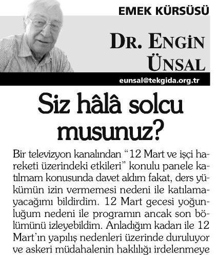 Bir televizyon kanalından "12 Mart ve işçi hareketi üzerindeki etkileri" konulu panele katılmam konusunda davet aldım fakat, ders yükümün izin vermemesi nedeni ile katılamayacağımı bildirdim. 12 Mart gecesi yoğunluğum nedeni ile programın ancak son bölümünü izleyebildim. Anladığım kadan ile 12 Mart’ın yapılış nedenleri üzerinde duruluyor ve askeri müdahalenin haklılığı irdelenmeye çalışılıyordu.