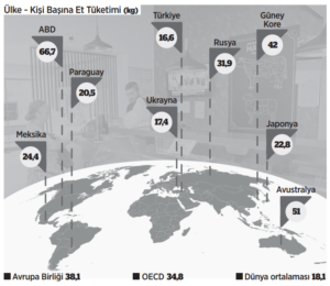 OECD-FAO Tarım Görünümü 2024-2033 raporuna göre kişi başına kırmızı et tüketimi OECD ülkelerinde 34,8 kilo, Avrupa’da 34,5 kilo, dünya genelinde 18,1 kilo iken Türkiye’de sadece 16,6 kilo.