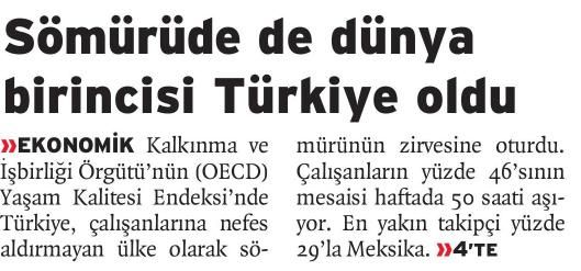 Sömürüde dünya zirvesi OECD Yaşam Kalitesi Endeksi´nde Türkiye, çalışanlarına nefes aldırmayarak açık arayla sömürünün zirvesine oturdu. Çalışanların yüzde 46´sının mesaisi haftada 50 saati aşıyor