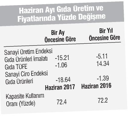 Sanayi ciro endeksi içinde gıda ürünlerinde, Mayıs ayında 252.1 olan endeks değeri, Haziran ayında 205.1’e inerek, bir ayda yüzde 15.21 oranında geriledi.(Aşağıdaki tablo )