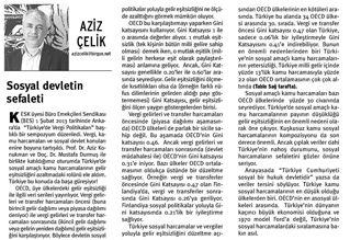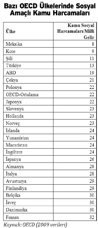 Türkiye’de sosyal amaçlı kamu harcamalarının payının düşüklüğü gelir eşitsizliğinin en önemli nedeni olarak öne çıkıyor. Kuşkusuz kamu sosyal harcamalarının kompozisyonu da son derece önemli. Ancak çıplak veriler dahi Türkiye’nin nahoş durumunu, sosyal harcamaların sefaletini gözler önüne seriyor. Anayasada "Türkiye Cumhuriyeti sosyal bir hukuk devletidir" yazsa da veriler tersini söylüyor. Türkiye kamu sosyal harcamalarının en düşük olduğu ülkelerden biri. OECD’nin en asosyal ülkeleri arasında.