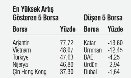2017 yılında Dünyada en fazla kazandıran yüzde 77.72 artan Arjantin Borsası oldu. Türkiye Vietnam ‘dan sonra üçüncü sırada geldi. Dikkat edersek ilk 4 ülke de ekonomik olarak kırılgan ülkelerdir. (Aşağıdaki tablo )