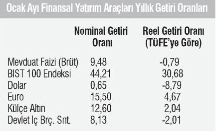 Ocak ayından Ocak ayına son bir yılda , finansal yatırım araçları içinde Borsa Nominal olarak yüzde 44.21 nominal getiri sağladı. TÜFE ‘ye göre hesaplanan Borsanın reel getiri oranı da yüzde 30.68 odu.
