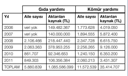 Tabloda Fon’dan Sosyal Yardımlaşma ve Dayanışma Vakıfları’na aktarılan ve buradan dağıtılan gıda ve kömür yardımları yer alıyor. 2006-2011 arasında 1 milyar liranın üzerinde gıda, 35 milyon liranın üzerinde kömür yardımı yapıldığını görüyoruz. Son yerel seçimlerin yapıldığı 2009 yılında (29 Mart) ve hemen öncesindeki 2008’de dağıtılan yardımlardaki artış, seçim dönemleri rüşvet mekanizmasının nasıl çalıştığını da gösteriyor. 2012 ve 2013 yılı rakamlarını bilemiyoruz. Ancak Ankara Büyükşehir Belediyesi 2012 yılında 110 bin aileye birer ton ithal kömür dağıttığını, 2013 yılında da bu rakamın altına düşülmeyeceğini duyurmuştu İşte AKP’nin sürdürülebilir yoksulluk politikası ve sadaka devletinde seçim rüşveti çarkı.