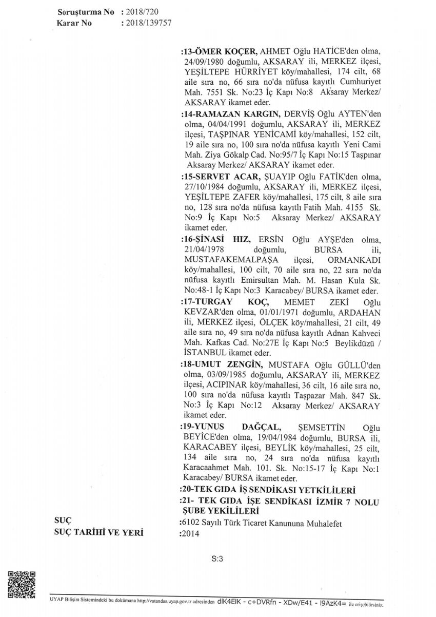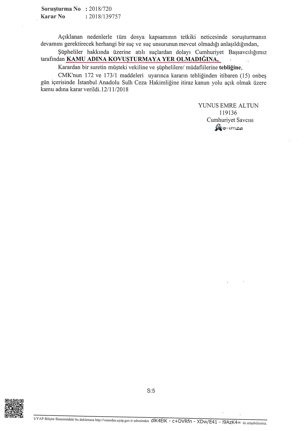 Yapılan inceleme sonucunda gerek ulusal gerek uluslararası sözleşmelere atıfta bulunan İstanbul Anadolu yakası Cumhuriyet Başsavcılığı suç unsuru oluşmadığı aksine "Sendikalaşma sonucu işten atmalara karşı eylemlerin uluslararası sözleşmelerden doğan demokratik bir hak olduğunu vurgulayarak kovuşturmaya yer olmadığına" KARAR verdi.