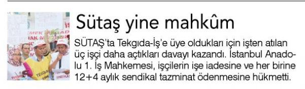 SÜTAŞ’ta Tekgıda-iş’e üye oldukları için işten atılan üç işçi daha açtıkları davayı kazandı, İstanbul Anadolu 1. iş Mahkemesi, işçilerin işe iadesine ve her birine 12 4 aylık sendikal tazminat ödenmesine hükmetti.