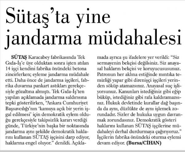 SÜTAŞ Karacabey fabrikasında Tek Gıda-İş’e üye olduktan sonra işten atılan 14 işçi kendini fabrika önündeki betona zincirlerken; eyleme jandarma müdahale etti. Daha önce de jandarma işçileri, fabrika duvarına pankart astıkları gerekçesiyle gözaltına almıştı.