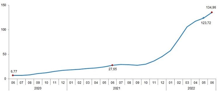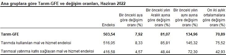Tarım-GFE’de (2015=100), 2022 yılı Haziran ayında bir önceki aya göre %7,92, bir önceki yılın Aralık ayına göre %81,07, bir önceki yılın aynı ayına göre %134,96 ve on iki aylık ortalamalara göre %70,89 artış gerçekleşti.