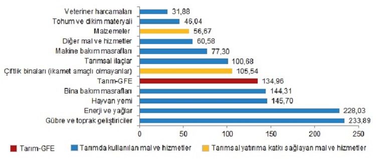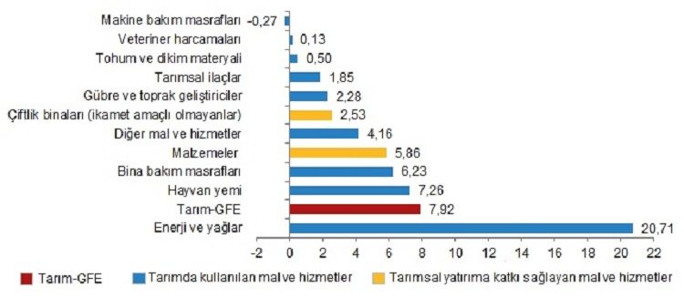 Yıllık artışın düşük olduğu alt gruplar sırasıyla, %31,88 ile veteriner harcamaları ve %46,04 ile tohum ve dikim materyali iken, yıllık artışın yüksek olduğu alt gruplar ise sırasıyla, %233,89 ile gübre ve toprak geliştiriciler ve %228,03 ile enerji ve yağlar oldu.