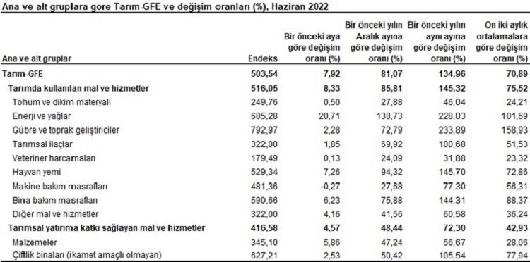Tarımsal girdi fiyat endeksi (Tarım-GFE) Temmuz 2022’de yıllık yüzde 134,96 ile yeni bir rekora imza atarken, aylık artış oranı yüzde 7,92 olarak gerçekleşti.