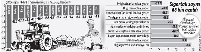 Rapora göre, Haziran 2018’de esnaf ve çiftçi sayısı Haziran 2017’ye göre yüzde 3.1’lik azalışla 2 milyon 703 bin oldu. Mevsimsellikten arındırılmış değerlere bakıldığında ise Mayıs 2018’e göre esnaf ve çiftçi sayısında 101 binlik azalış gerçekleşti. Diğer yandan, araştırmada Haziran 2018’de Haziran 2017’ye göre 4/a sigortalı çalışan sayısında toplamda 560 bin artış olurken, Mayıs 2018’e göre 68 bin azaldığı görüldü.
