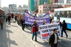 Tedbiren tasfiye kararı alınan TARİŞ Pamuk ve Yağlı Tohumlar Birliğine bağlı Çiğli İplik Fabrikası’nda işten çıkarılanların TARİŞ Genel Müdürlüğü önündeki eylemine, sabah Ankara’dan dönen TEKEL işçileri de katıldı.
