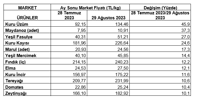 Ağustos ayında markette 37 ürünün 28’inde fiyat artışı, 9’unda fiyat azalışı görüldü. Ağustos ayında aylık bazda markette fiyatı en fazla artan ürün yüzde 45,9 ile kuru üzüm oldu. Kuru üzümdeki fiyat artışını yüzde 37,3 ile maydanoz, yüzde 27 ile yeşil fasulye, yüzde 24,6 ile kuru kayısı takip etti. Markette fiyatı en çok düşen ürün yüzde 20,1 ile havuç oldu. Havuçtaki fiyat düşüşünü yüzde 17,1 ile kuru soğan, yüzde 14 ile sivri biber, yüzde 13,3 ile salatalık izledi.