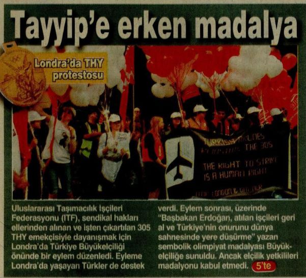 Uluslararası Taşımacılık İşçileri Federasyonu (ITF), sendikal haklan ellerinden alman ve işten çıkartılan 305 THY emekçlsiyle dayanışmak İçin Londra´da Türkiye Büyükelçiliği önünde bir eylem düzenledi. Eyleme Londra´da yaşayan Türkler de destek verdi.Eylem sonrası üzerinde Başbakan Erdoğan» atılan işçileri geri ai ve Türkiye´nin onurunu dünya sahnesinde yere düşürme yazan sembolik olimpiyat madalyası Büyükelçiliğe sunuldu. Ancak elçilik yetkilileri madalyonu kabul etmedi.