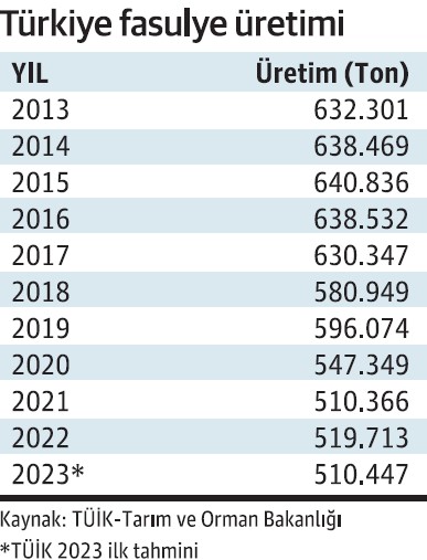 Tarım ve Orman Bakanlığı ile Türkiye İstatistik Kurumu verilerine bakıldığında Türkiye’nin taze fasulye üretimi son 9 yılda 130 bin tonun üzerinde azaldı. Bundan 10 yıl önce 2013 yılında Türkiye’nin taze fasulye üretimi 632 bin 301 bin tondu. Üretim 2015 yılında 640 bin 836 tona kadar çıktıktan sonra her yıl düşmeye başladı. 2021 yılında 510 bin 366 ton ile en düşük seviyeye indi. 2022’de 519 bin 713 ton olarak gerçekleşen üretim, Türkiye İstatistik Kurumu’nun 2023 yılı ilk tahminine göre 510 bin 447 ton olacak.