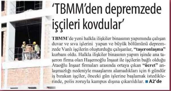 TBMM´de yeni halkla ilişkiler binasının yapımında çalışan duvar ve sıva işlerini yapan ve büyük bölümünü depremzede Vanlı işçilerin oluşturduğu çalışanlar, taşeronlaşma kurbanı oldu.