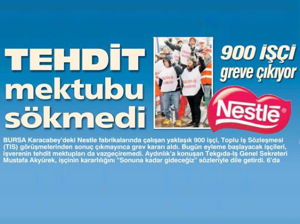 Grev kararının fabrikanın itibarını zedeleyeceğini ve gelecekte yapılabilecek yatırımları da etkileyeceğini öne süren Nestle Yönetimi, "Grevi destekleyip desteklememek kararı artık size aittir. Vereceğiniz bu karar, fabrikamızın ve sizlerin geleceğini muhakkak ki yakından etkileyecektir. Biz, Nestle ailesi olarak sizlerin ve fabrikamıI zın uzun dönemli çıkarlarını gözetmek durumundayız. İşte bu yüzden sizlere bu gilendirmeyi yapmak istedik" ifadeleriyle işçileri üstü kapalı olarak tehdit etti.