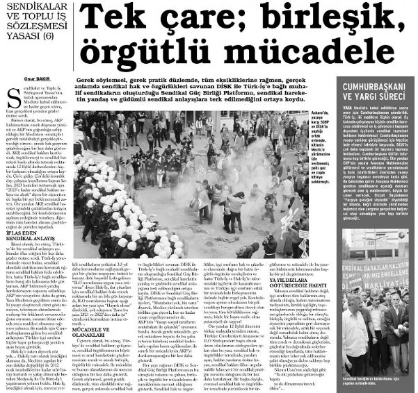 Yalnızca sendikal hakların değil, işçi sınıfının tüm haklarının ateş altında olduğu, kıdem tazminatının tasfiyesinin, kiralık işçiliğin, taşeronlaştırmanın yaygınlaştırılmasının gündemde olduğu bir süreçte, birleşik, örgütlü ve militan, emeğin siyasetini yapmaktan geri durmayacak bir mücadele, artık bir seçenek değil zorunluluk halini almış durumda.