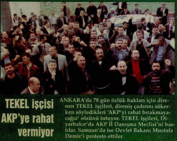 TEKEL işçileri AKP’yi rahat bırakmıyor ANKARA’da günlerce özlük haklan için direnen TEKEL işçileri, direniş çadırını sökerken söyledikleri ‘AKP’yi rahat bırakmayacağız’ sözünü tutuyorlar. TEKEL işçileri, Diyarbakır’da AKP il Danışma Meclisi’ni bastı. Samsun’da ise Devlet Bakanı Mustafa Demir’i protesto etti. Diyarbakır TEKEL Tütün İşleme ve işletme Fabrikası işçileri, milletvekillerinin de katıldığı AKP il Danışma Kurulu toplantısının yapıldığı Kent Düğün Salonu önünde protesto eylemi yaptılar. 100’ü aşkın işçinin katıldığı protestoda AKP toplantısının yapıldığı salona girmek isteyen işçilerle AKP’liler arasında arbede yaşandı.