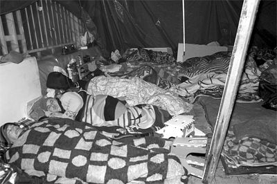 Biraz ileride ise, bir başka parti açtığı stantta çay dağıtıyor, acıkanların karnını doyuruyor. Onlar da ‘çaya çağırıyorlar’ direnişçileri. Derme çatma çadırlarda, yere açılan yataklarda (yani kartonlara) uzanmış işçiler, uyumaya çalışıyor. Bu gürültünün arasında nasıl uyunduğu sorusuna ise işçiler, “Sen de 40 gün bekle burada, yorgunluktan hemen uyursun” yanıtını veriyorlar. Bazı çadırlarda, zeminlerin altına tahta konulmuş, daha sıcak tutsun diye. Bazıları ise, tahtanın üzerine halı sermiş. İzmir çadırının girişine, ‘Gavur İzmir’ yazıldığını görüyoruz. Her tarafı naylonla kapatılmış çadırın zeminine ise tahtalar döşenmiş ve elektrikli ısıcılar yerleştirilmiş. Sonradan, İzmir çadırı için ‘Hilton’ dendiğini öğreniyoruz.