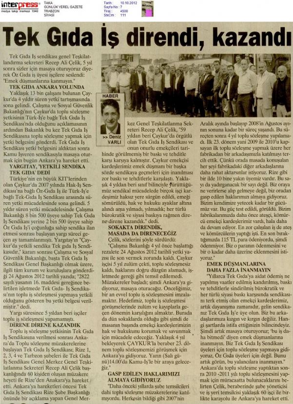 Yargıtay’ın "Çaykur’da yetkili sendika Tek gıda İş Sendikasıdır" kararı sonrası Çalışma ve Sosyal Güvenlik Bakanlığı, başta Tek Gıda İş Sendikası Genel Başkanlığı olmak üzere, ilgili tüm kurum ve kuruluşlara gönderdiği 24 Ağustos 2012 tarihli yazıda; "2822 sayılı yasanın 16. maddesi gereğince belirtilen işletmede Tekgıda- İş Sendikasının toplu iş sözleşmesi yapmaya yetkili olduğunu gösteren bu yetki belgesi verilmiştir." dedi.