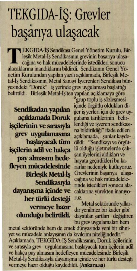 Metal sektöründe yıllardır yenilmez bir kader gjbi olunduğu belirtildi dayatılan şartlan değiştiren bu grev uygulamaları hem metal sektöründe hem de emek dünyasında yeni bir zihniyet ve mücadele anlayışının da kıvılcımı niteliğindedir." Açıklamada, TEKGIDA-İŞ Sendikasının, Doruk işçilerinin ve sırasıyla grev uygulamasına başlayacak tüm işçilerin adil ve hakça pay almasını hedefleyen mücadelesinde Birleşik Metal-lş Sendikasıyla dayanışma içinde ve her türlü desteği vermeye hazır olduğu kaydedildi. (Ankara.aa)