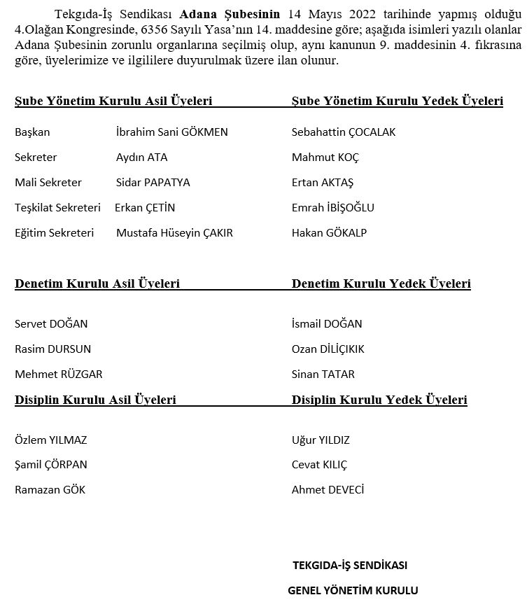 TEKGIDA-İŞ SENDİKASI ADANA ŞUBESİ KONGRE SEÇİM SONUÇ İLANI