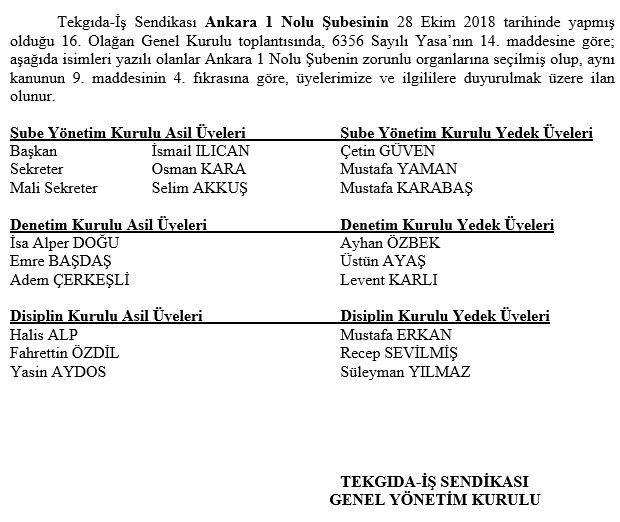 TEKGIDA-İŞ SENDİKASI ANKARA 1 NOLU ŞUBESİ KONGRE SEÇİM SONUÇ İLANI