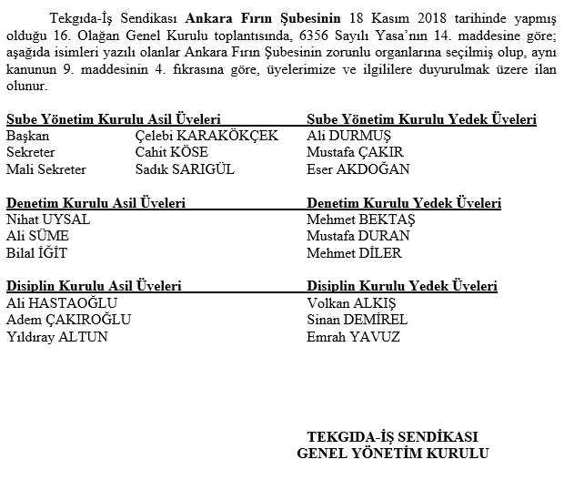 TEKGIDA-İŞ SENDİKASI ANKARA FIRIN ŞUBESİ KONGRE SEÇİM SONUÇ İLANI
